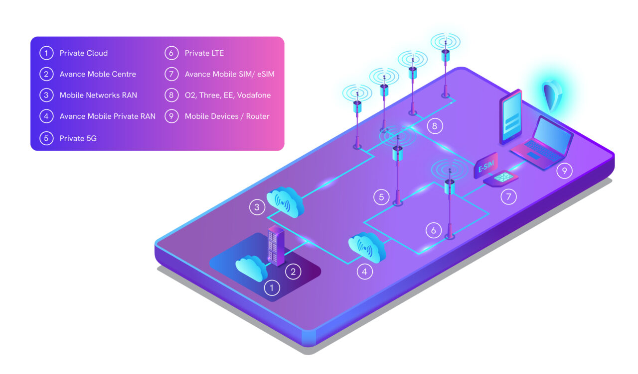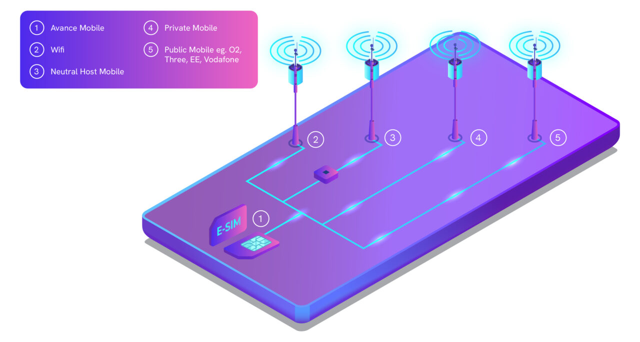 Public 4G/5G Radio Access Networks providing broad UK-wide coverage and acting as one of the available links for devices using Avance SIM/eSIM.